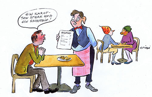 The Vegetarian.- A Carrot Steak and a Smoothie !?    From the series Homo ineptuSie können diesen Cartoon kaufen. Auch als Postkarte erhältlich!